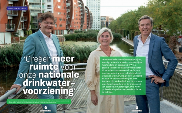 In de nieuwste editie van Vewin's magazine Waterspiegel doen drie waterprofessionals – Arjan Driesprong (Oasen), Joyce Nelissen (WML) en Pieter Litjens (Vewin) – een gezamenlijke oproep aan de politiek: neem snel maatregelen om de drinkwatervoorziening van de toekomst veilig te stellen.